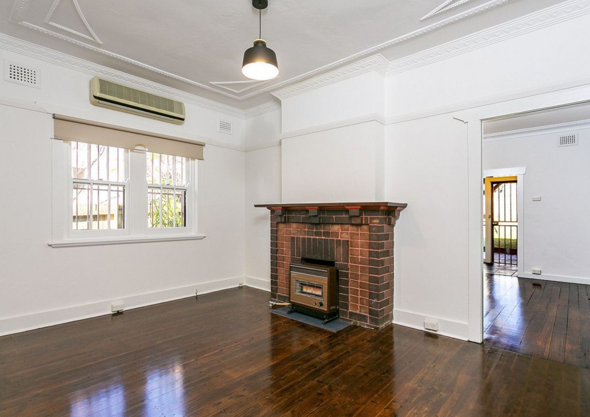 - Sun-lit lounge room with decorative fireplace