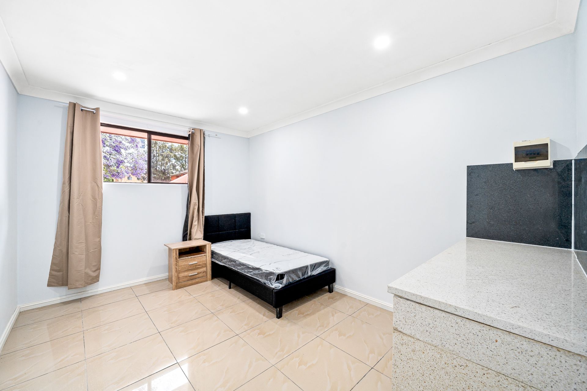 Single bed, bedside table and bar fridge included