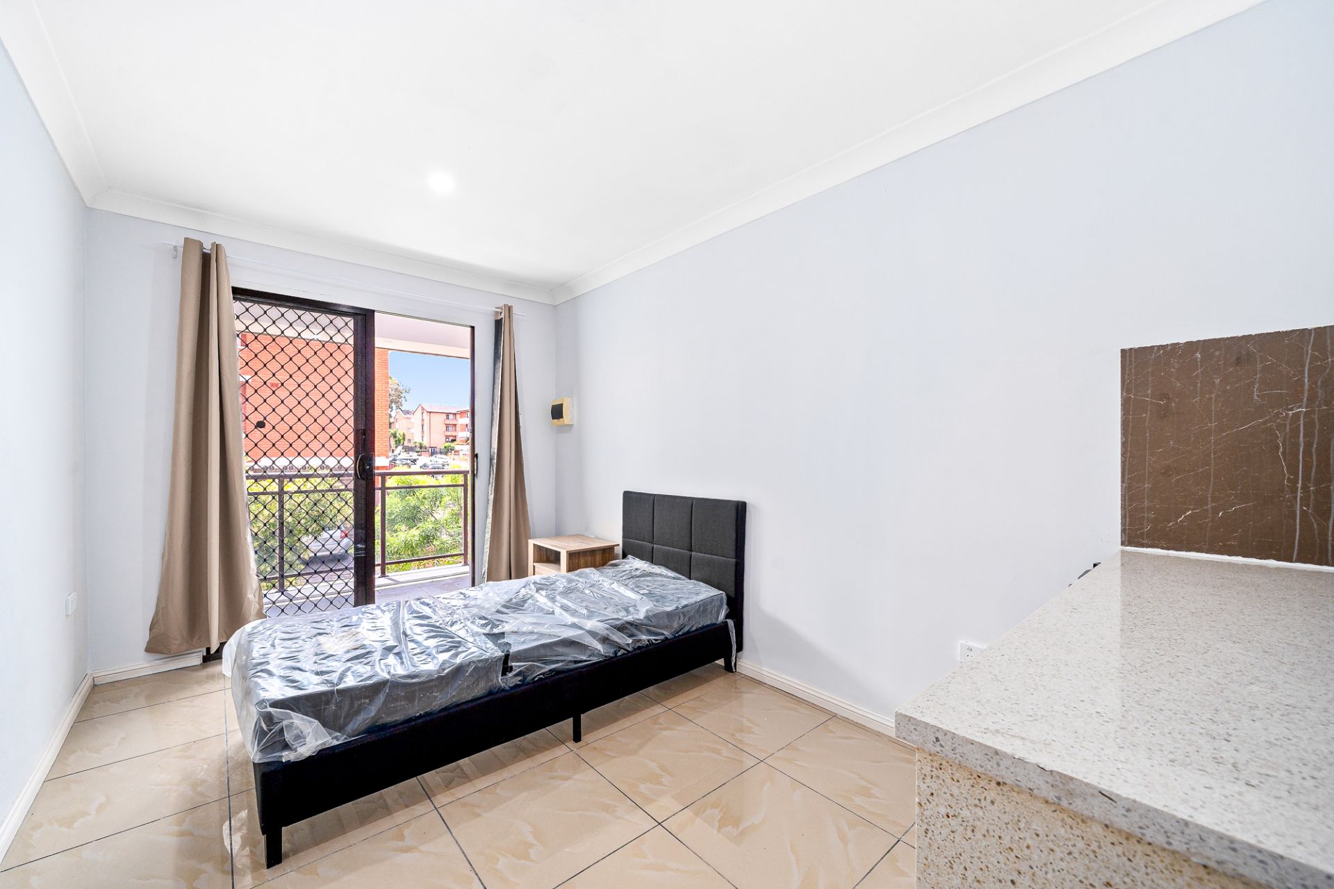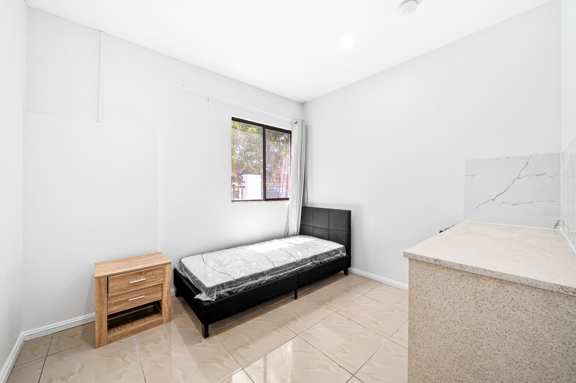 Single bed, bedside table and bar fridge included