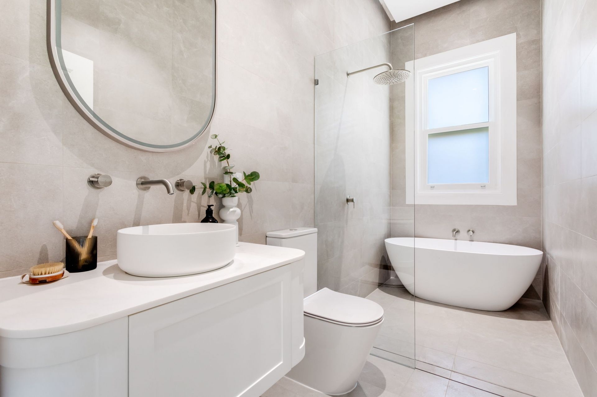 - Main bathroom with rainwater shower and standalone bath, Parisi tapware